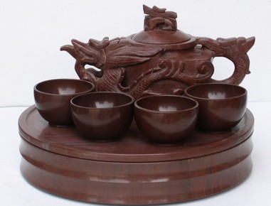 木魚石茶具是指用整塊木魚石作出來的茶具,主要包括茶壺、酒壺、竹節杯、套筒杯、冷水杯、茶葉筒等。將水放在木魚石茶具中浸泡兩小時,水中溶解的微量元素和礦物質的含量即能達到國家礦泉水限量指標。因木魚石中鈾及稀土元素含量適中,故此茶具的防腐和通透性好,用其泡茶即便是在酷暑季節,五天內茶水仍可飲用不會變質。木魚石茶具對酒有奇效,經山東省食品質量監督檢驗中心檢測表明,用木魚石器具盛酒(指白酒)24小時,甲醇含量可降50%、雜醇油含量可降65%以上,酒精含量不變。任何白酒只要在木魚石酒具中放置20分鐘,即可變得綿軟甘甜可口,辣味苦味明顯減輕,與盛入其他酒具中的酒形成明顯的差別。